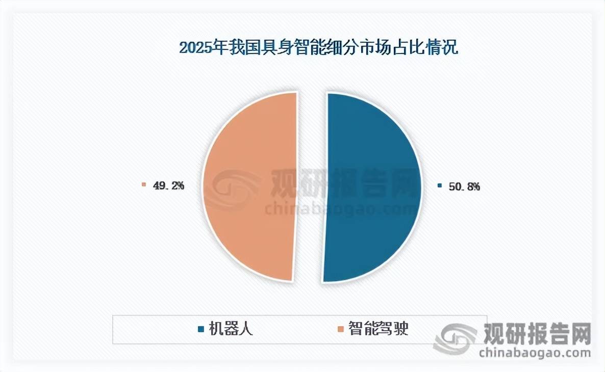 从细分市场来看,2025年我国具身智能细分市场占比最高的为机械人,占比为50。8%;其次为智能驾驶,占比为49。2%。