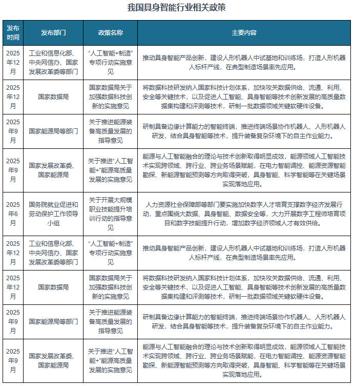 政策方面,为鞭策具身智能行业的成长,我国发布了多项行业政策,如2025年12月工业和消息化部、地方网信办、国度成长委等部分发布的《“人工智能+制制”专项步履实施看法》鞭策具身智能产物立异,扶植人形机械人中试和锻炼场,打制人形机械人标杆产线,正在典型制制场景率先使用。2025年12月国度数据局发布的《国度数据局关于加强数据科技立异的实施看法》将数据科技研发纳入国度科技打算系统,加速攻关数据供给、畅通、操纵、平安等环节手艺,以及推进人工智能、具身智能等手艺立异成长的高质量数据集建立和评测等手艺,研制一批数据范畴环节软硬件设备。