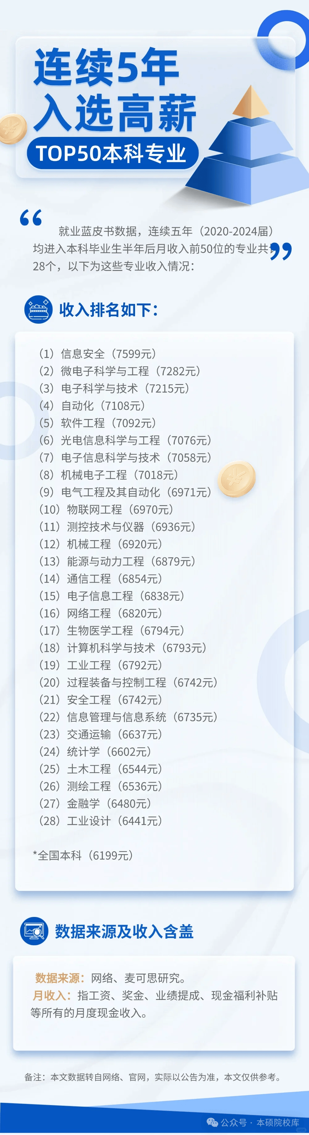 比来麦可思研究发布的就业蓝皮书,给了大师一个 “稳准狠” 的参考:2020-2024 届本科结业生中,有 28 个专业持续五年跻身半年后月收入前 50 位!最低月薪都比全国本科平均(6199 元)高 242 元,最高的间接冲到 7599 元,这波 “长红专业” 实的抗打!