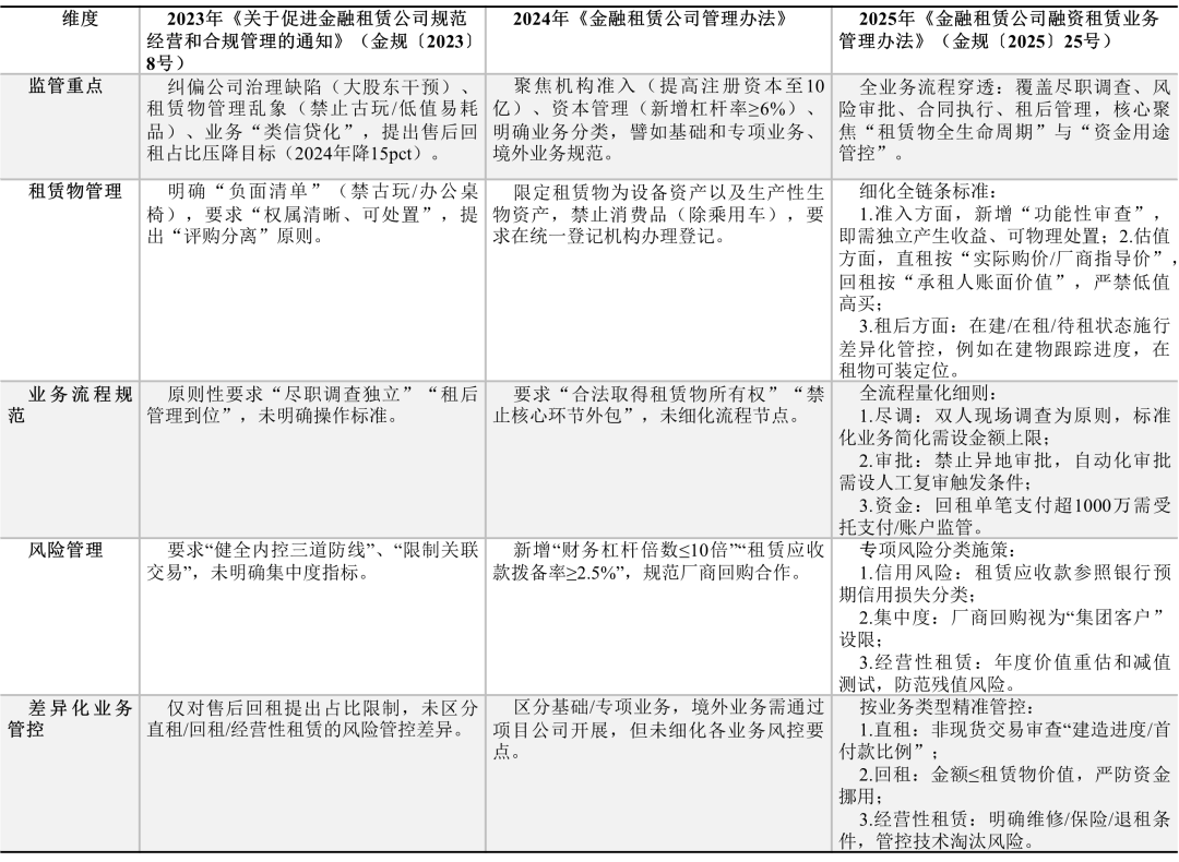 《金融租赁公司融资租赁营业办理法子》并非孤立政策,而是对近年监管思的深化取落地。通过取《推进金融租赁公司规范运营和合规办理的通知》和《金融租赁公司办理法子》(2024)的焦点条目对比,下图可清晰看到行业监管的迭代径。《25号文》的焦点冲破正在于“从框架到细则”“从定性到定量”——此前政策多为“什么”,而《25号文》明白“怎样做”,特别正在租赁物估值、资金领取、租后监测等环节环节给出可落地的操做尺度,大幅压缩监管套利空间。